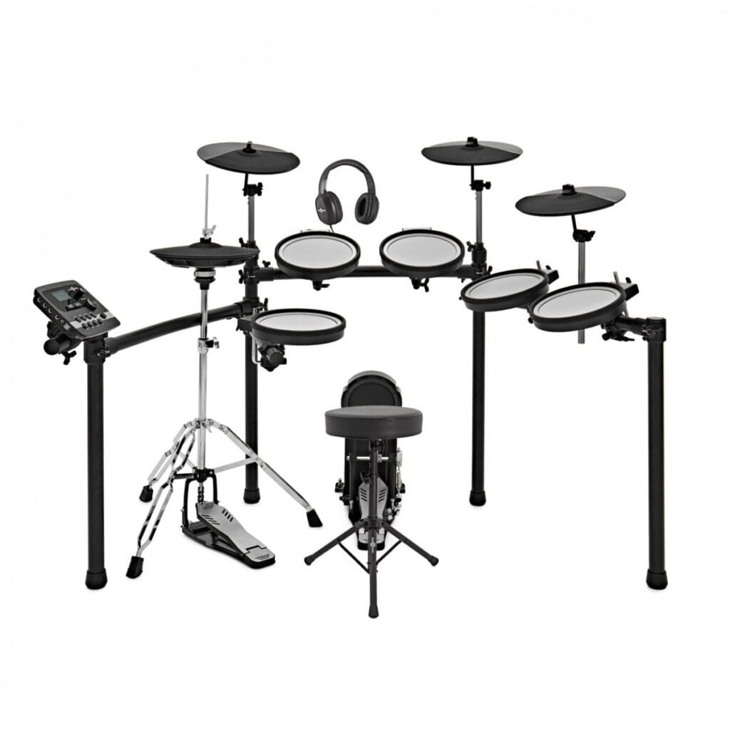 Het Digital Drums 550 Elektronisch Drumstel is uitgerust met 10″ dubbelzone drumpads die een grotere speeloppervlakte bieden, wat de nauwkeurigheid ten goede komt. De hihatstandaard is een echte hihatstandaard, wat bijdraagt aan de stabiliteit en functionaliteit. Het pakket bevat ook een Sidekik en drumkruk, wat zorgt voor een compleet drumset-up zonder dat er extra accessoires nodig zijn. De constructie is ontworpen voor duurzaamheid en gebruiksgemak, met een focus op het minimaliseren van onderhoud.