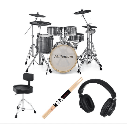 De Millenium MPS-1000 E-Drum Set Bundle is een complete e-drumset met de uitstraling van traditionele akoestische drumsets. Deze set bevat een houten ketel, drumpads met dubbellaagse Mesh Heads en volledig bespeelbare bekkenpads in de kleur Grey Line. De E-Drum module biedt 820 sounds, 40 preset kits en 40 user kits. Belangrijke componenten zijn de 20″ x 16″ bass drum pad en de 13″ x 5.5″ snare pad met twee zones. Ook zijn er drie bekkenstatieven met boom-arm en een ergonomische pneumatisch verstelbare drumstoel inbegrepen.